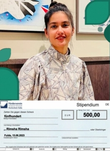 Frau Rimsha Rimsha ist gebürtig aus Pakistan und absolviert aktuell ihr Studium an der Hochschule Fulda. Die Erfahrungen an der Hochschule Fulda ermöglichen ihr, ihre akademischen und persönlichen Ziele weiterzuverfolgen. Insbesondere die Gleichberechtigung von Mann und Frau in Bezug auf Bildung und Wissen sind ihr eine Herzensangelegenheit. Zitat Frau Rimsha: „Education is my passport to a better future.“