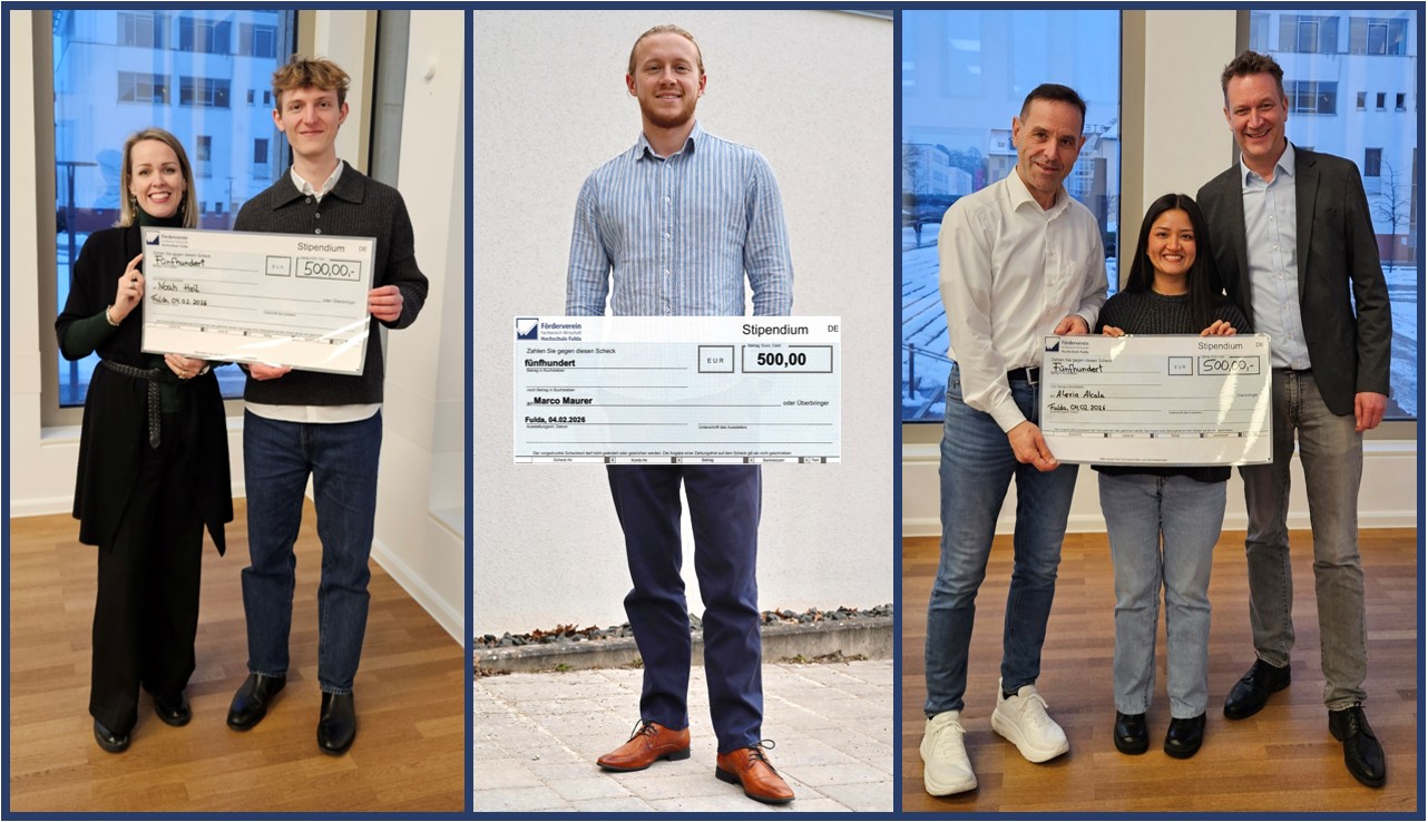 Der Förderverein des Fachbereichs Wirtschaft hat im Wintersemester 2025/2026 erneut drei Stipendien in Höhe von je 500 € vergeben. Gefördert werden Studierende, die ein Auslandssemester oder -praktikum absolvieren oder geplant haben. Die Stipendienvergabe fand am 4. Februar 2026 an der Hochschule Fulda statt. Ausgezeichnet werden Alexia Alcala, Noah Heil und Marco Maurer, die durch ihr besonderes Engagement, ihre internationale Ausrichtung und ihre vielfältigen Aktivitäten im Studium und darüber hinaus überzeugen.